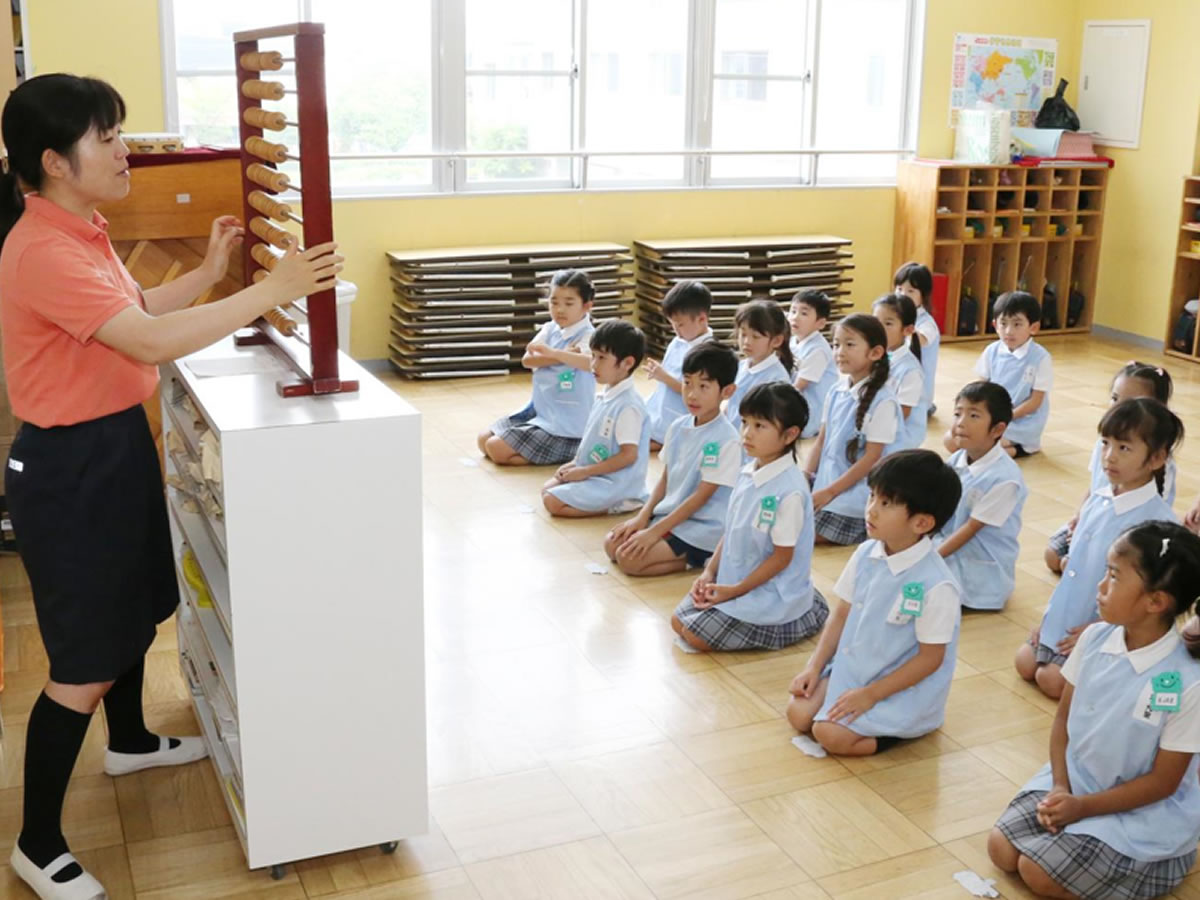 数字は日々の生活で身近な存在です。本園では積極的に算数学習を進めています。百珠そろばんや数字カードを用いて視覚的に数字を学習し、論理的思考力の基礎を築きます。加えて、時計遊びにより時間を意識し、規則正しい生活を身に付けます。日々継続して行われる簡単な計算は脳の前頭前野を使うため、脳の活性化に繋がります。算数学習により、計算能力や暗算能力、集中力向上のほか、脳が理解・記憶・表現する学習のサイクルに適応できるようになります。