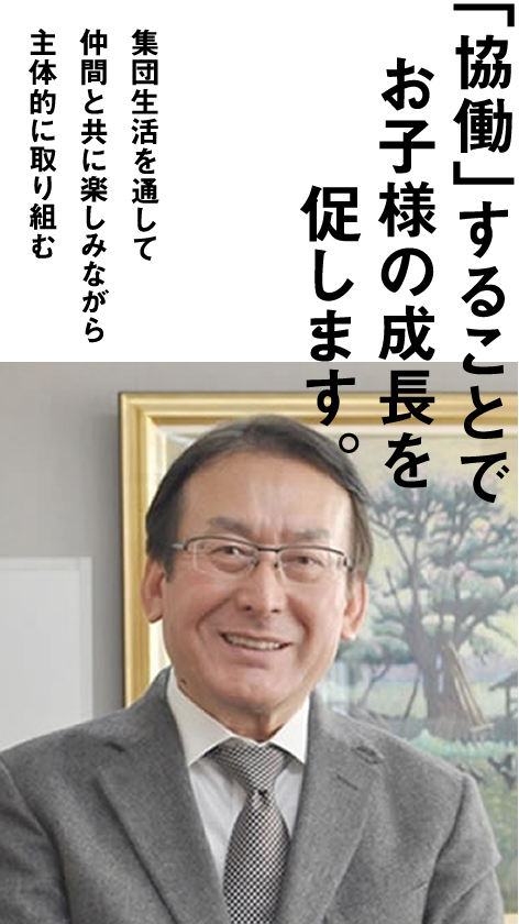 まず、本園では「集団生活を通して、仲間と共に楽しみながら、主体的に取り組む」こと、即ち「協働」することでお子様の成長を促します。幼児は「挑戦する、真似る、競う、繰り返す」の4つが大好きです。また、幼児は人に褒められる・認められることを好みます。それ故、幼児は幼稚園という集団の中で、楽しみながら成長していくことができるのです。