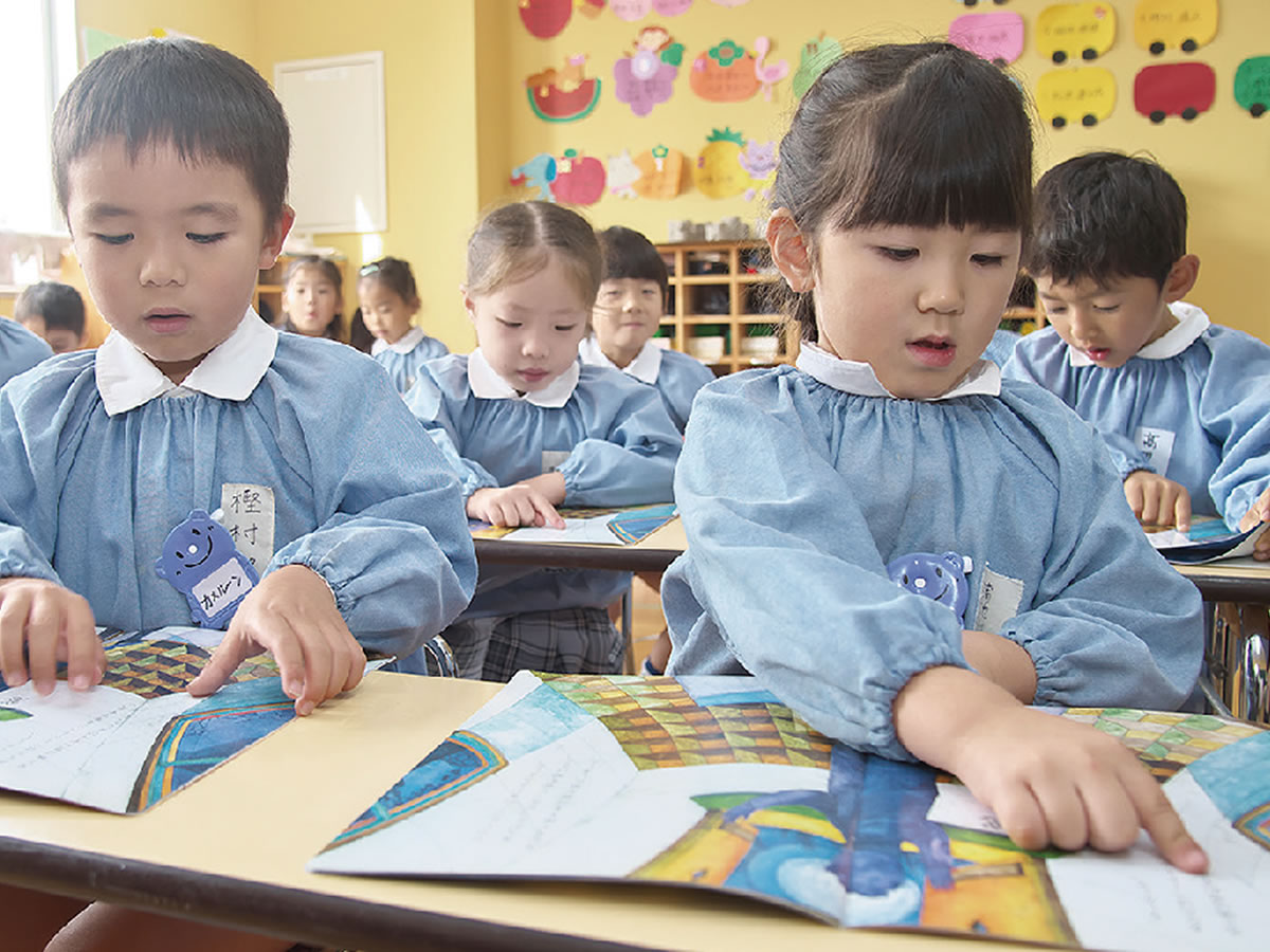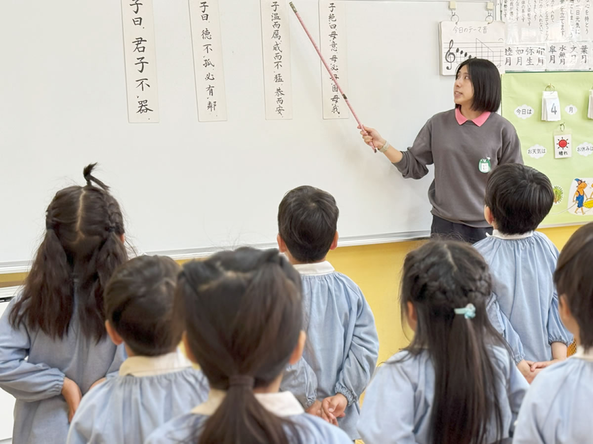 中国の古典に『読書百遍、意自ずから通ず』という言葉がありますが、これは難しい本でも何回も読むうちにその趣旨が読む人の心に伝わってくるという意味です。幼児でも、声に出して諳んじることでいつの間にか言葉の意味が頭の中に入ってきます。日本語の読む・書く・話す能力を高めることは心の教育でもあります。幼児期の言葉教育により、情感豊かな心を育みます。