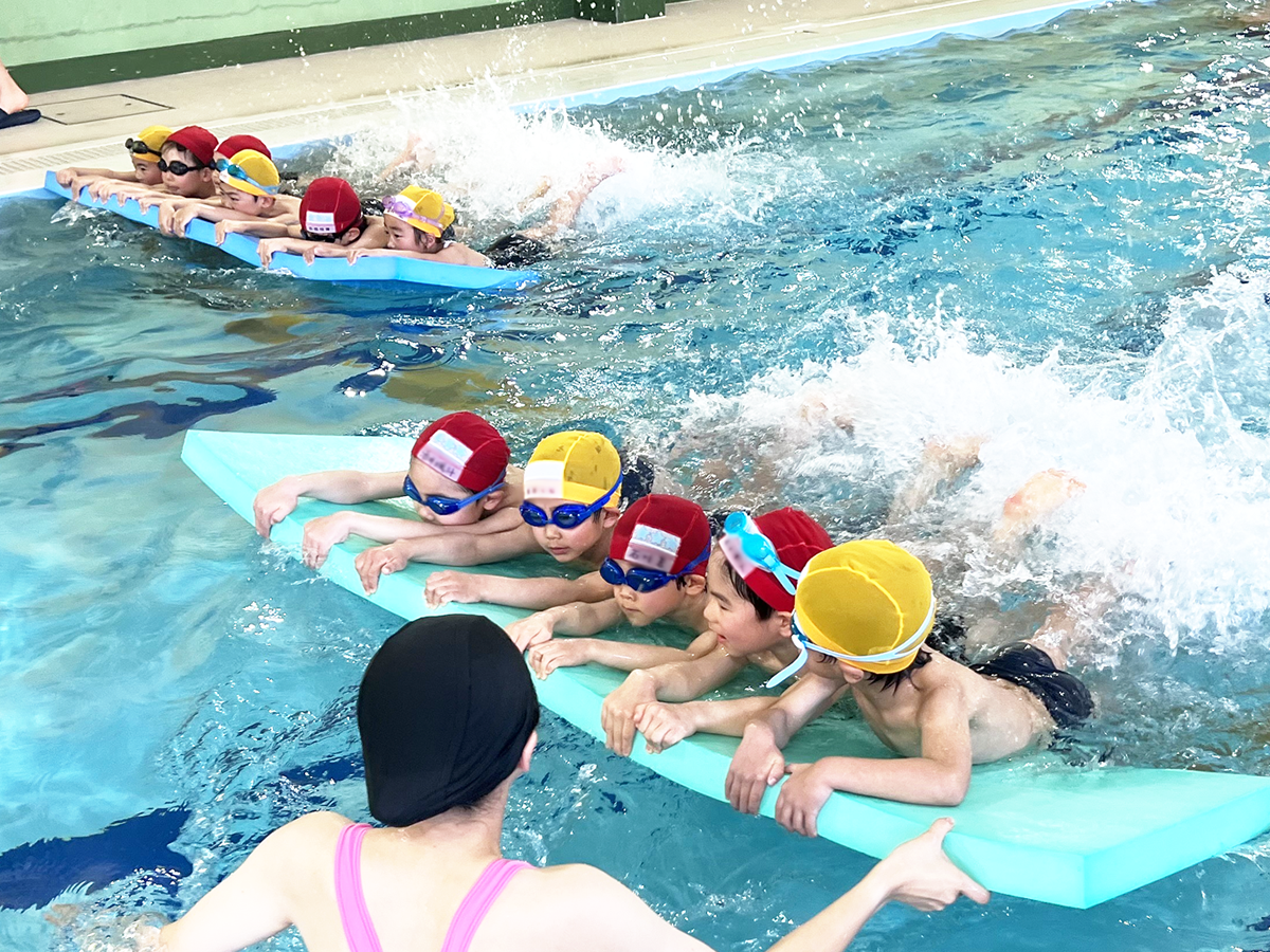 いずみ幼稚園では卒園までにほとんどの子が15Mクロールを泳げるようになります。これは、自園にある室内温水プールのため、通年通して指導ができる環境があるからです。正課の水泳と課外教室の先生が同じ専任講師の指導員なので、それぞれお子さんの特徴を理解した上で、効率の良い指導が成り立ちます。子どもが安心して上達しやすい環境はいずみ幼稚園ならではの強みです。水泳は幼児期の運動に最適です。心肺機能の向上はもちろん、全身運動であるため、普段使用しない筋肉まで鍛えることができます。体の表面にある筋肉だけでなく、姿勢や身体のバランスと体幹も同時に強化できます。なので、その後どんなスポーツをするにしても役に立ちます。また、生涯スポーツとして継続しやすい水泳は、子供の可能性を広げ、幅広い体験に繋がっていきます。